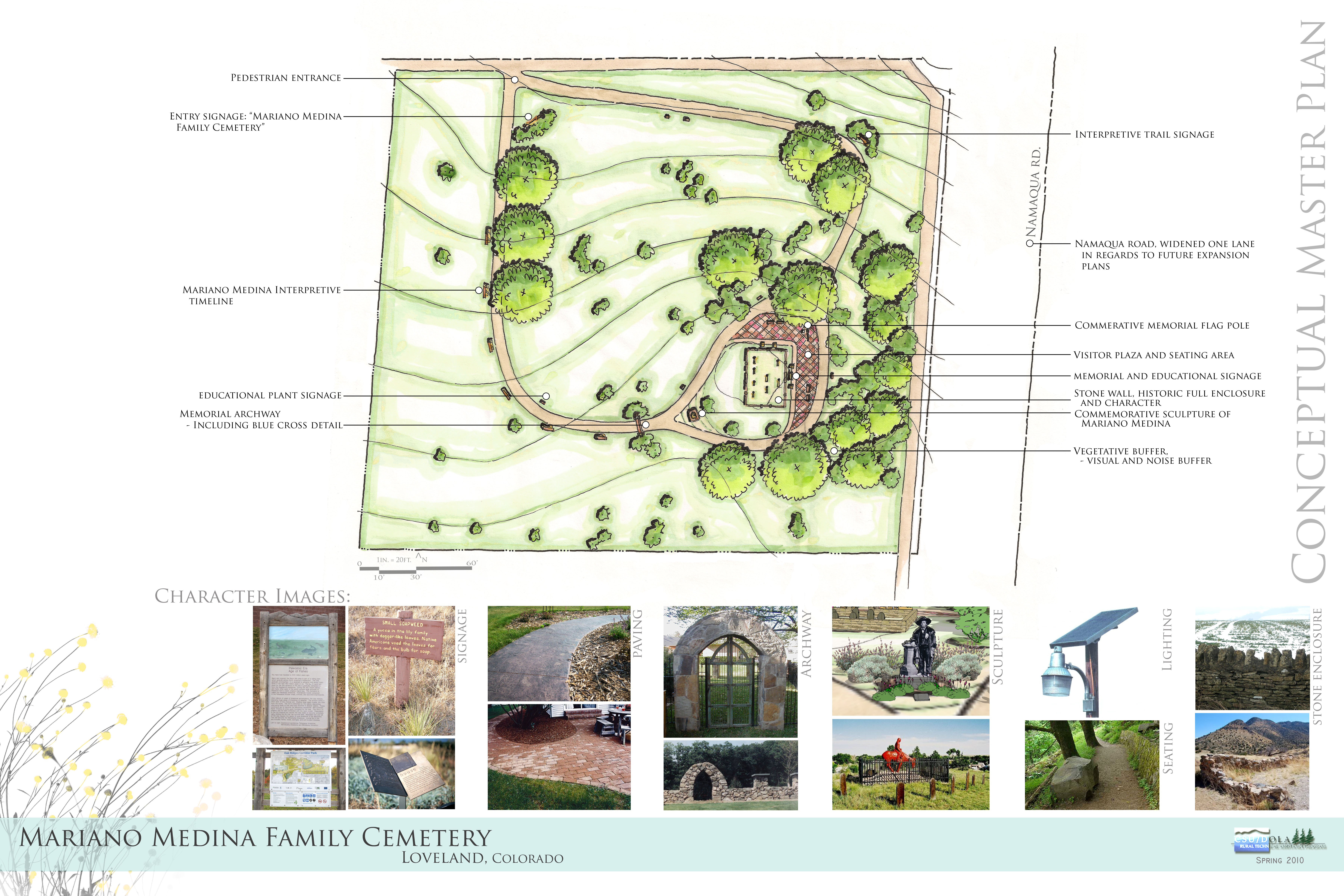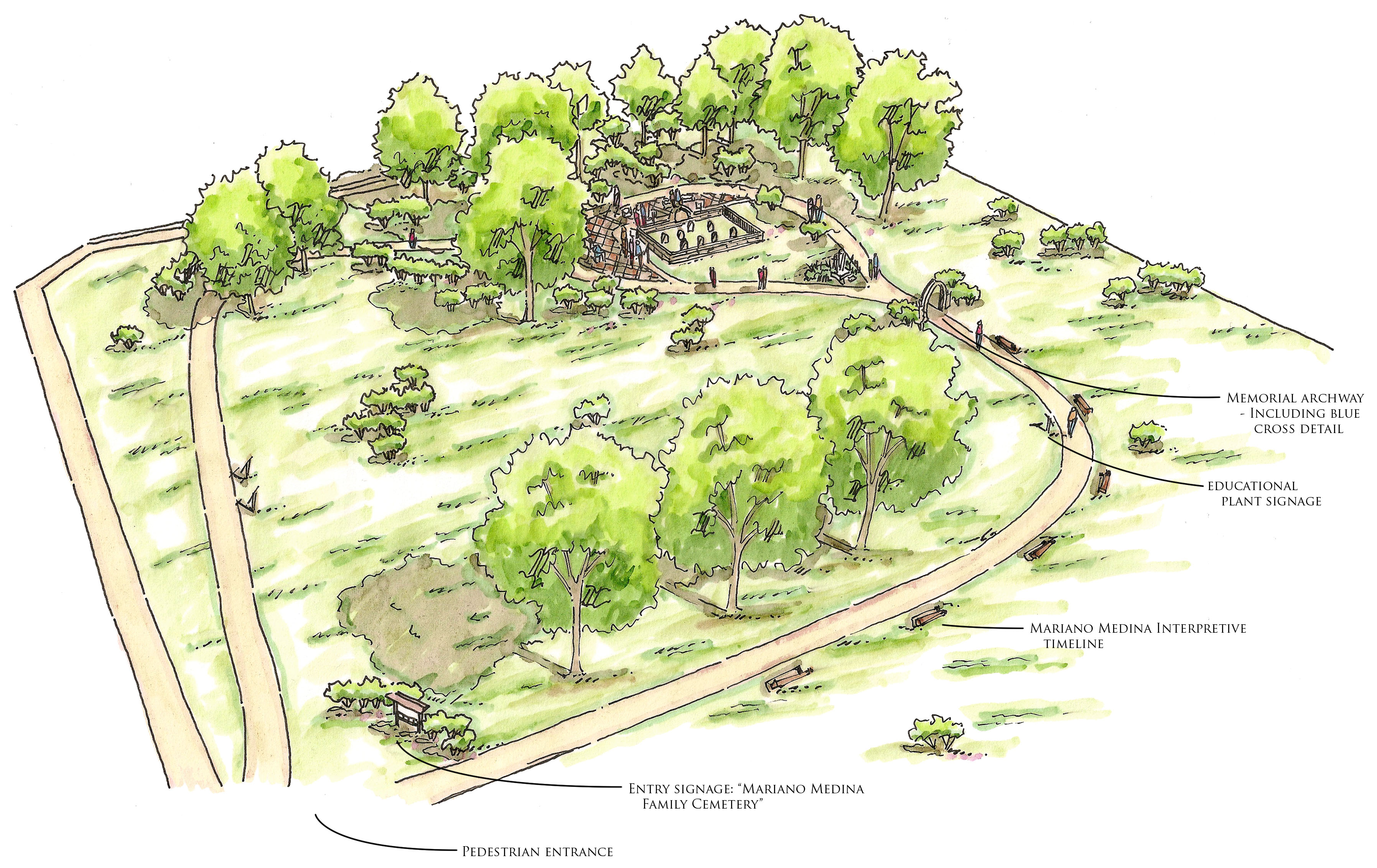Aerial perspective view facing towards the south east. The main pedestrian entrance point is located on the north edge of the site off of 3rd st. An entrance sign and prominent planting denote the memorial cemetery entrance. upon entering the site, the visitor passes a series of interpretive timeline segments, each representing a prominent event in Mariano medina’s history. The visitor then enters the main plaza area through a stone arch, ornamented with Medina’s “blue cross”.