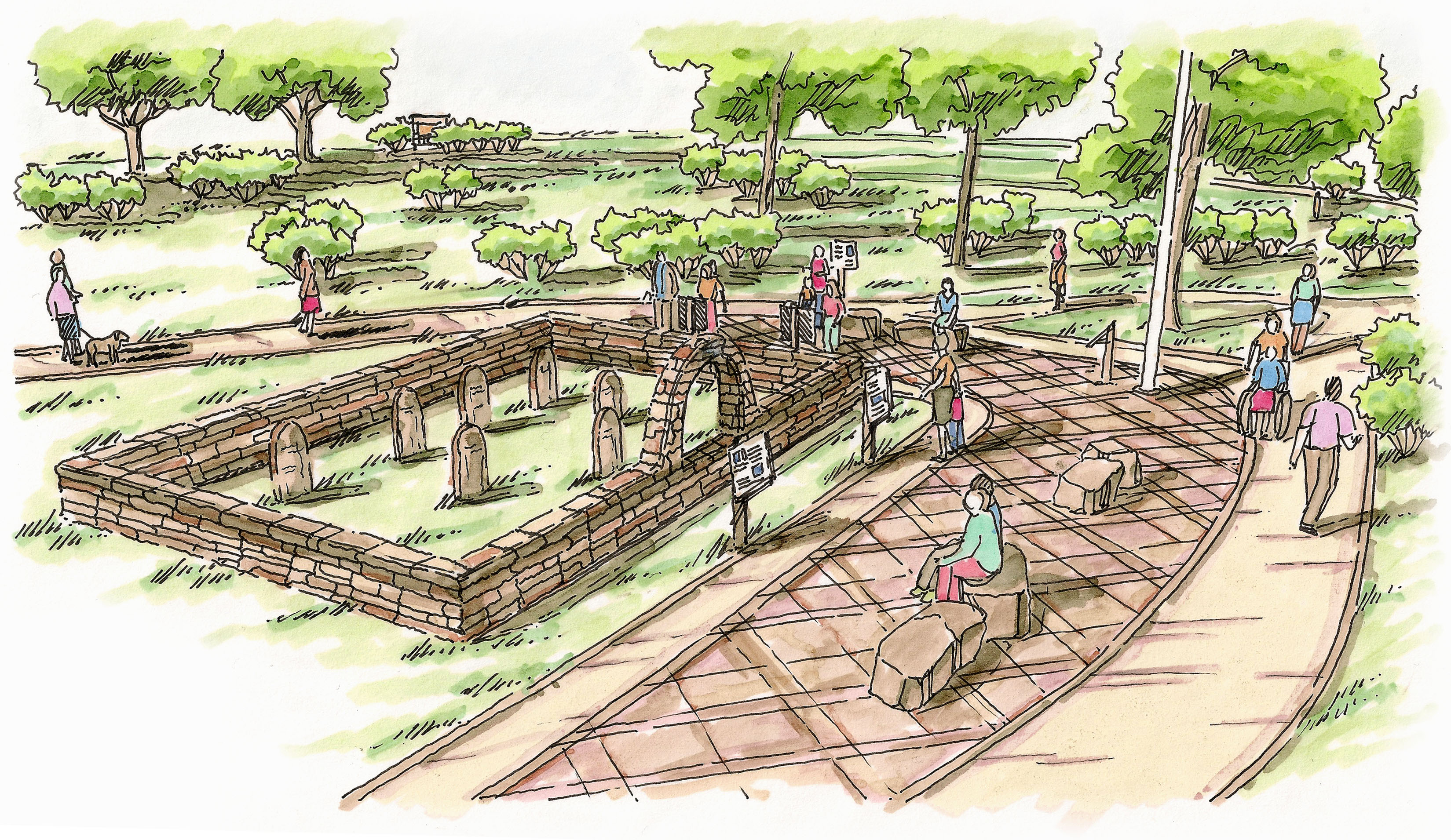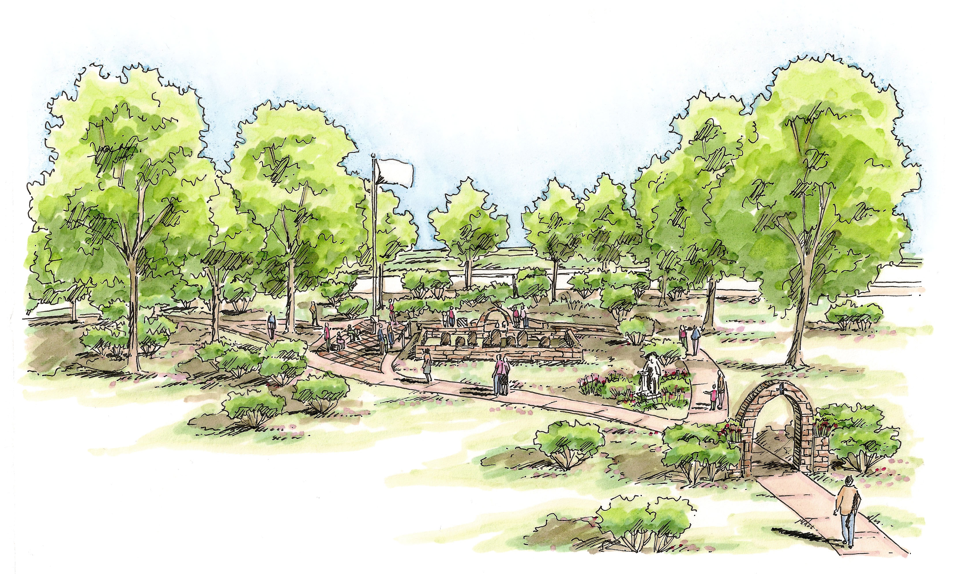 Aerial perspective depicting a close up view of the memorial plaza looking towards the north west. The plaza and stone wall enclosure are situated on the highest point of the site, and a vegetative buffer would be ideal to lessen the impact of Namaqua Rd. on the site. The plaza itself is meant to be a safe place of reflection and remembrance. Interpretive signage will be placed throughout the site in order to guide the visitor through Medina’s story and history.