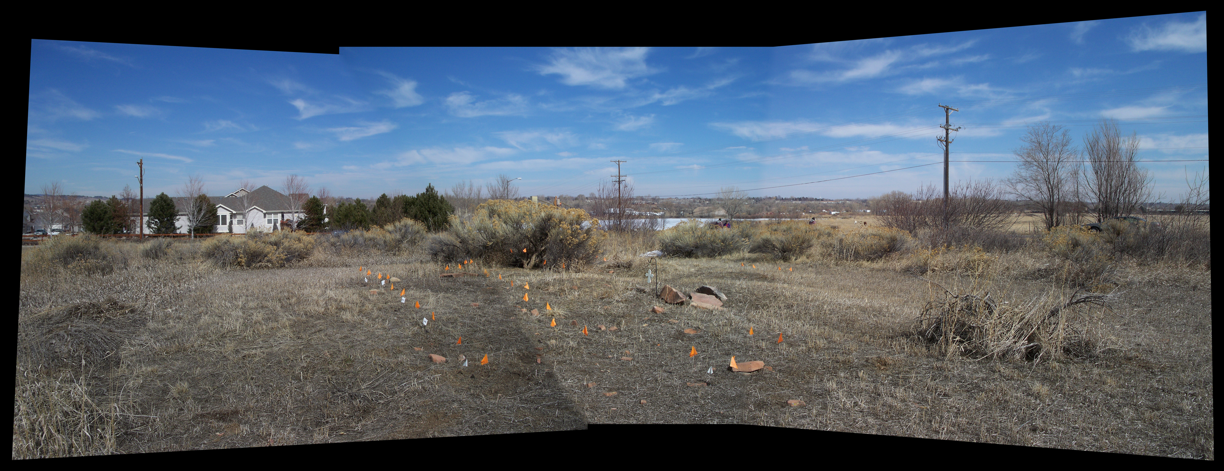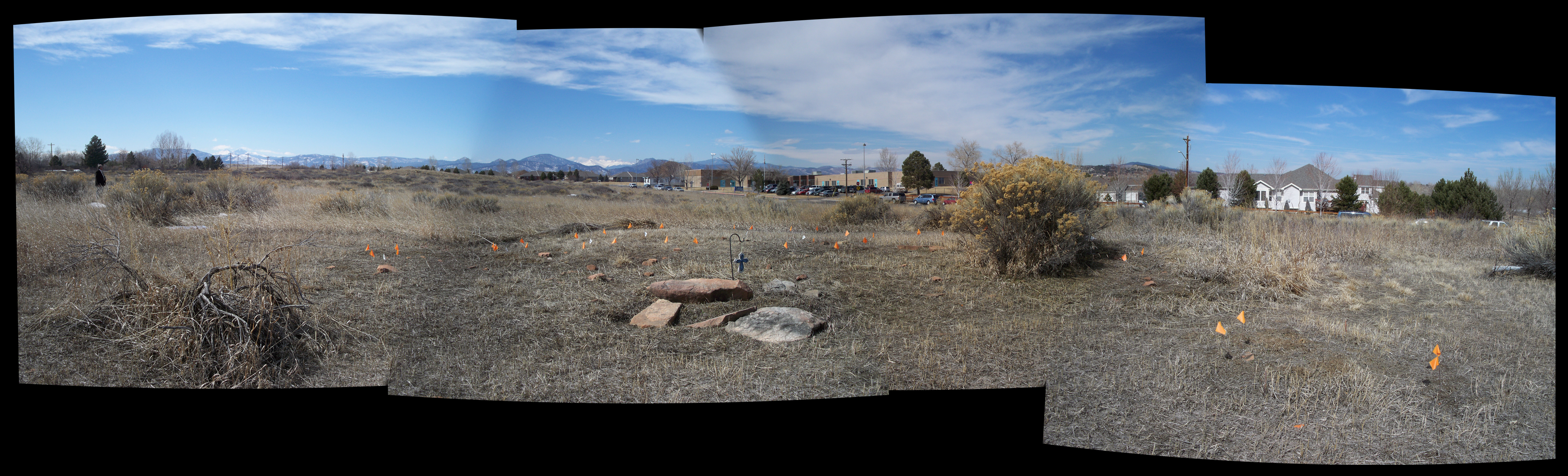 Existing site looking towards the southeast, the orange flags denote historic grave plots.